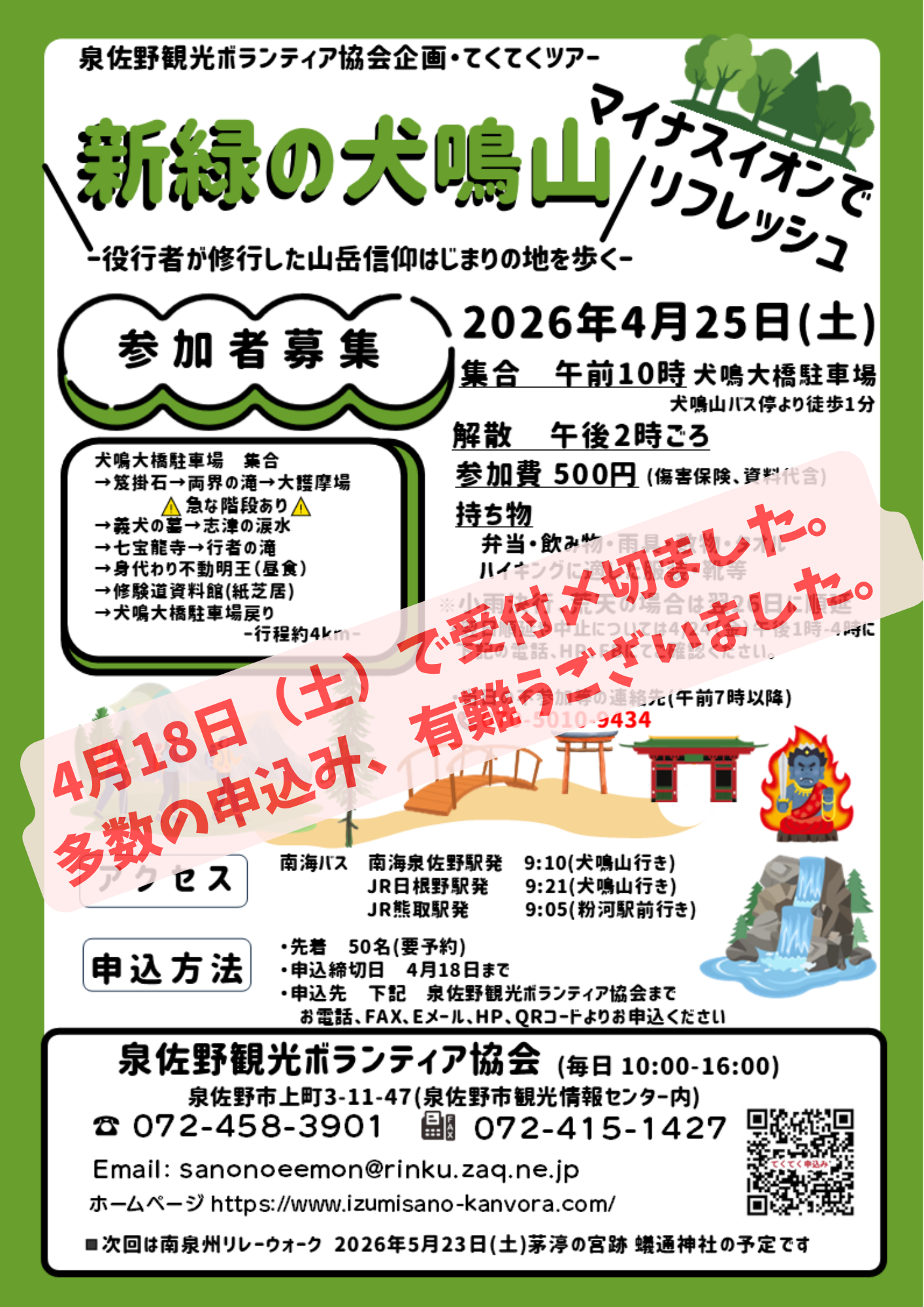 2026.4.25_開催 てくてくツアー受付終了しました。 2026年4月25日(土)開催のてくてくツアー 「 新緑の犬鳴山」は、 4月18日(土)で受付終了しました。 多数の申込み有難うございました。 お問い合わせ先 :泉佐野観光ボランティア協会 ☎072-458-3901