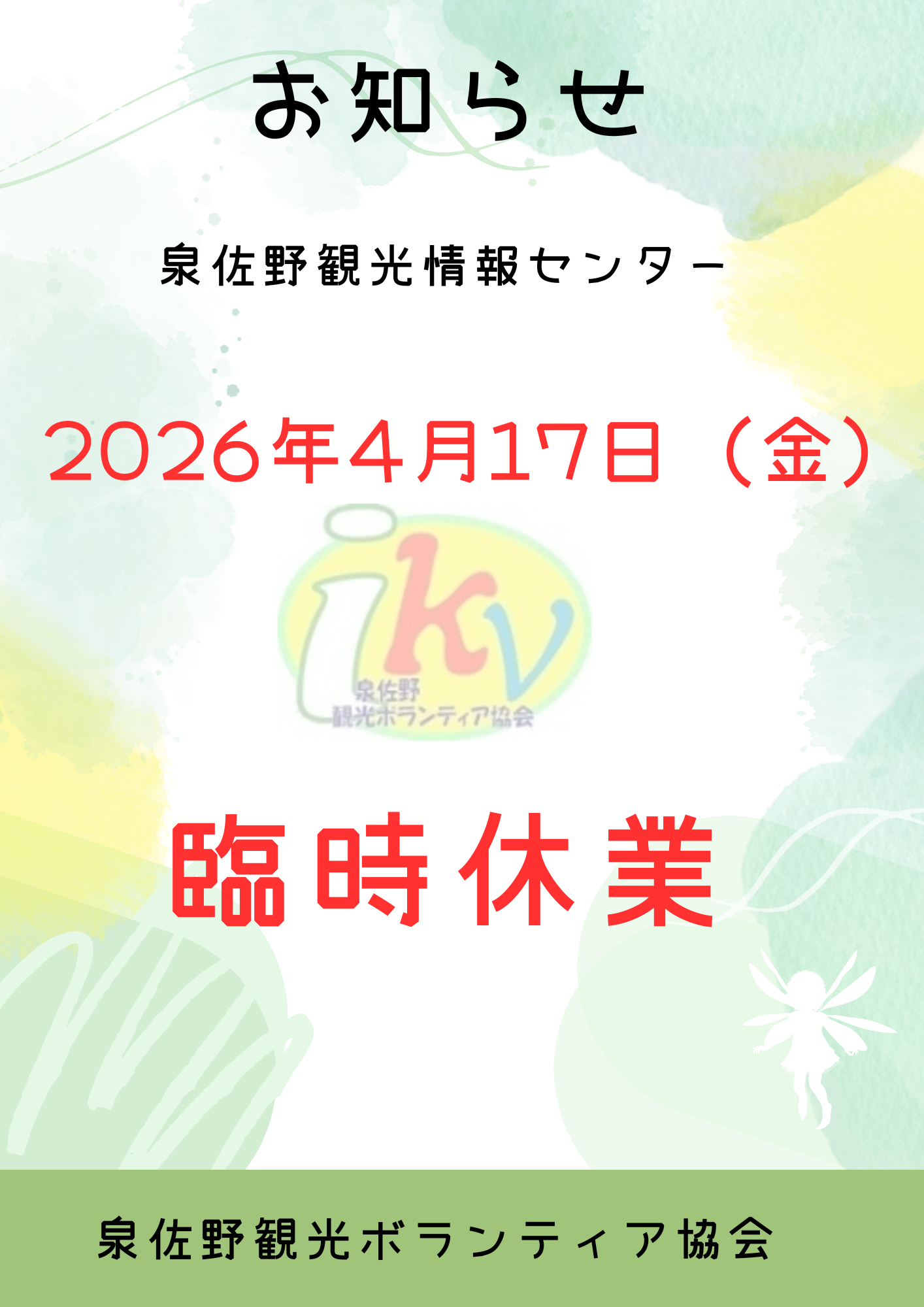 2026.4.17_泉佐野市観光情報センター臨時休業のお知らせ 2025年4月17日(金)泉佐野市観光情報センターは総会開催のため 休業致します。 レンタサイクル業務も休業致します。 悪しからずご了承下さい。 お問い合わせ先 :泉佐野観光ボランティア協会 ☎072-458-3901