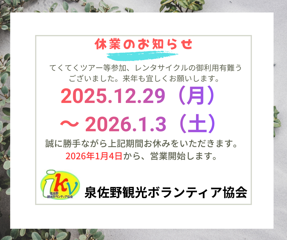 泉佐野市観光情報センター は、年末・年始2025.12.29~2026.1.3まで休業致します。2026.1.4より通常営業いたします。。